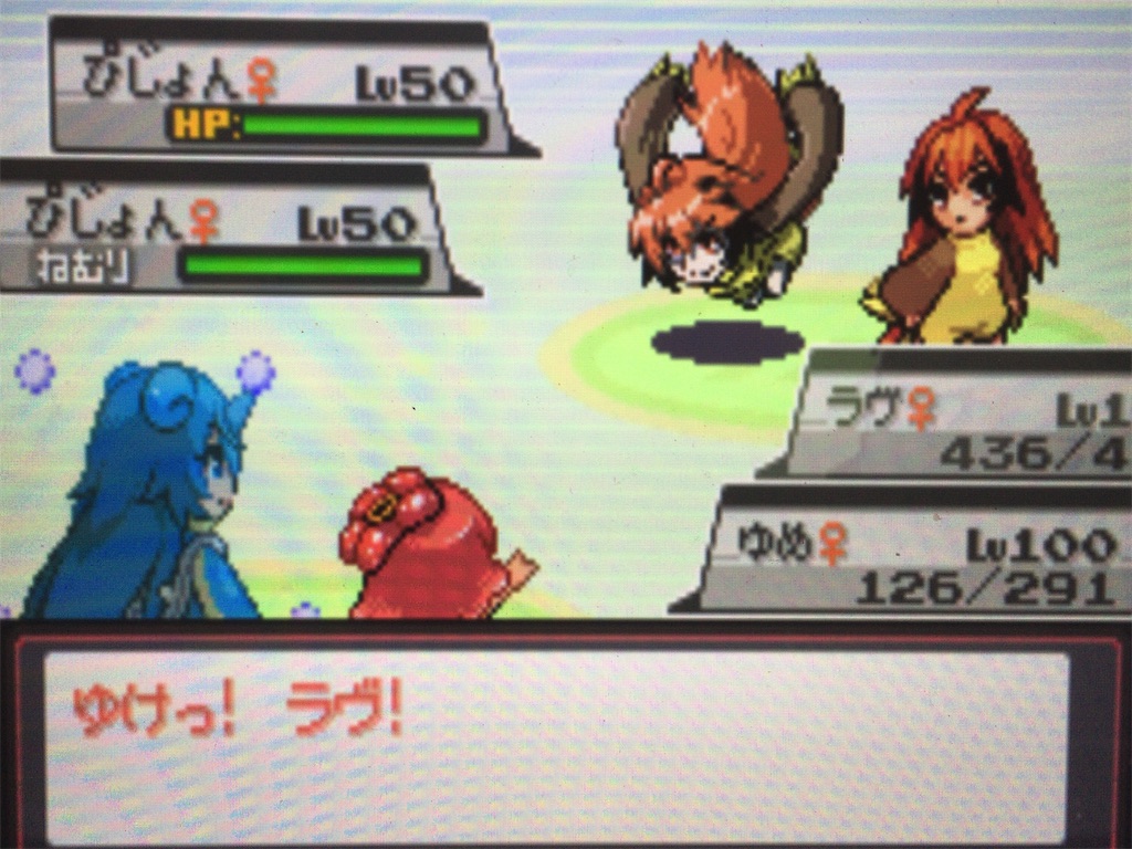ラヴで「ほろびのうた」して、両守るで1ターン稼いで、ラヴをゆめに替えつつアイネでぴじょんRに「くろいまなざし」したところ